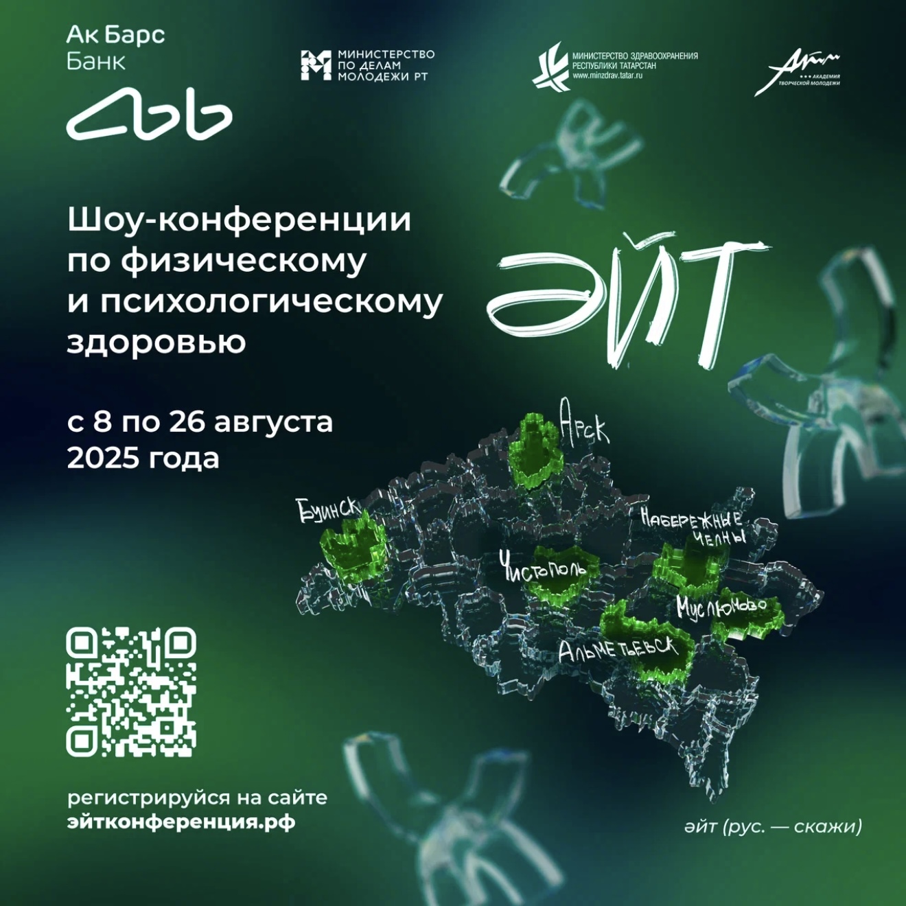С 8 по 26 августа в шести муниципальных образованиях Татарстана пройдут образовательные сессии по физическому и психологическому здоровью «ӘЙТ». Посетить программу смогут как местные жители, так и из близлежащих районов, для которых будет организован трансфер. Зарегистрироваться на мероприятие в одном из городов можно на сайте: эйтконференция.рф.