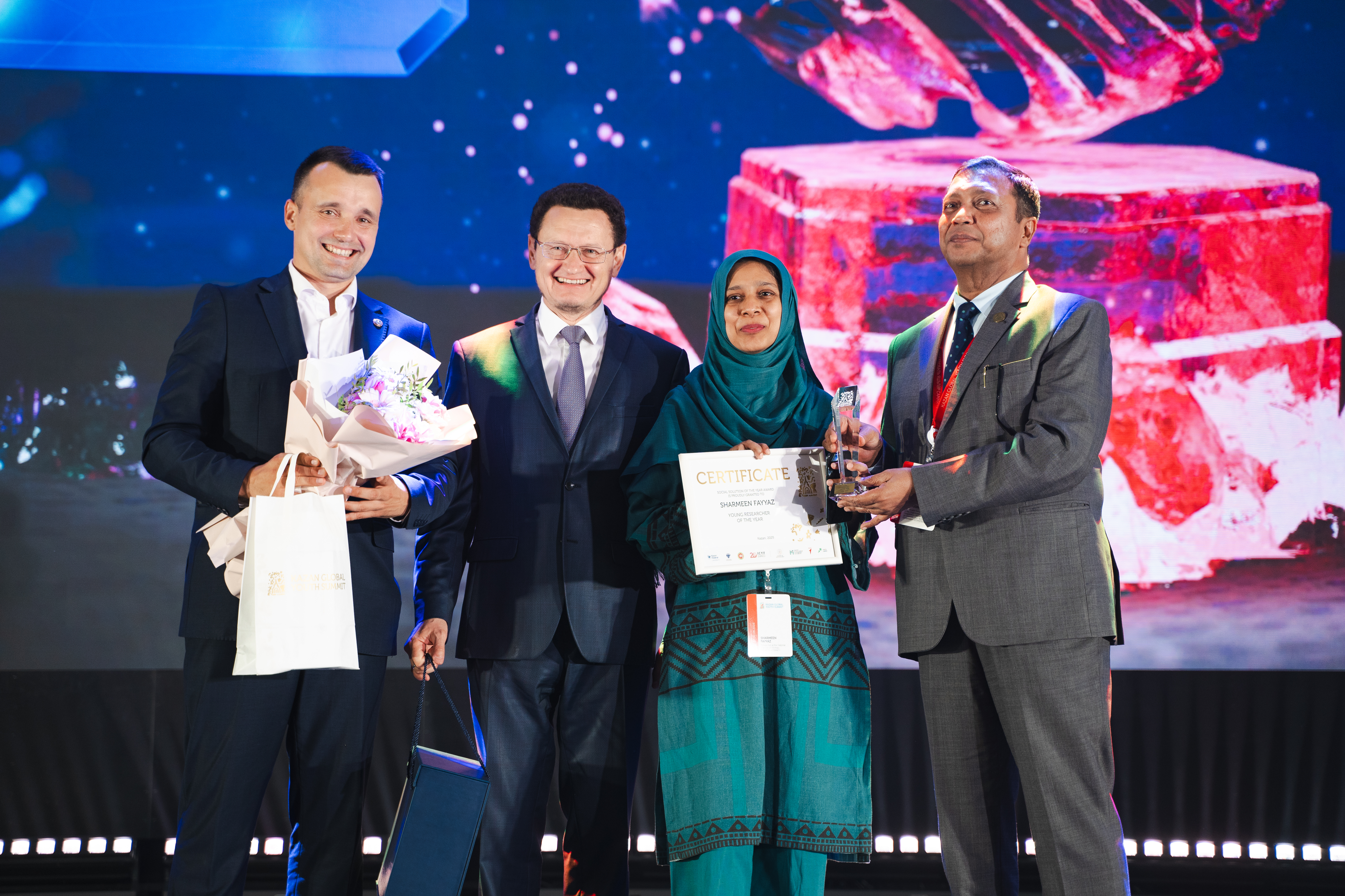 Награды получили д-р Шармин Файяз (Пакистан), вирусолог Национального института вирусологии Карачи, автор более 20 публикаций по HIV и COVID-19, и Аль-Мунтасер Ахмед Мохаммед (Йемен), научный сотрудник КФУ, автор более 90 работ в области нефтехимии и лауреат президентской стипендии РФ.