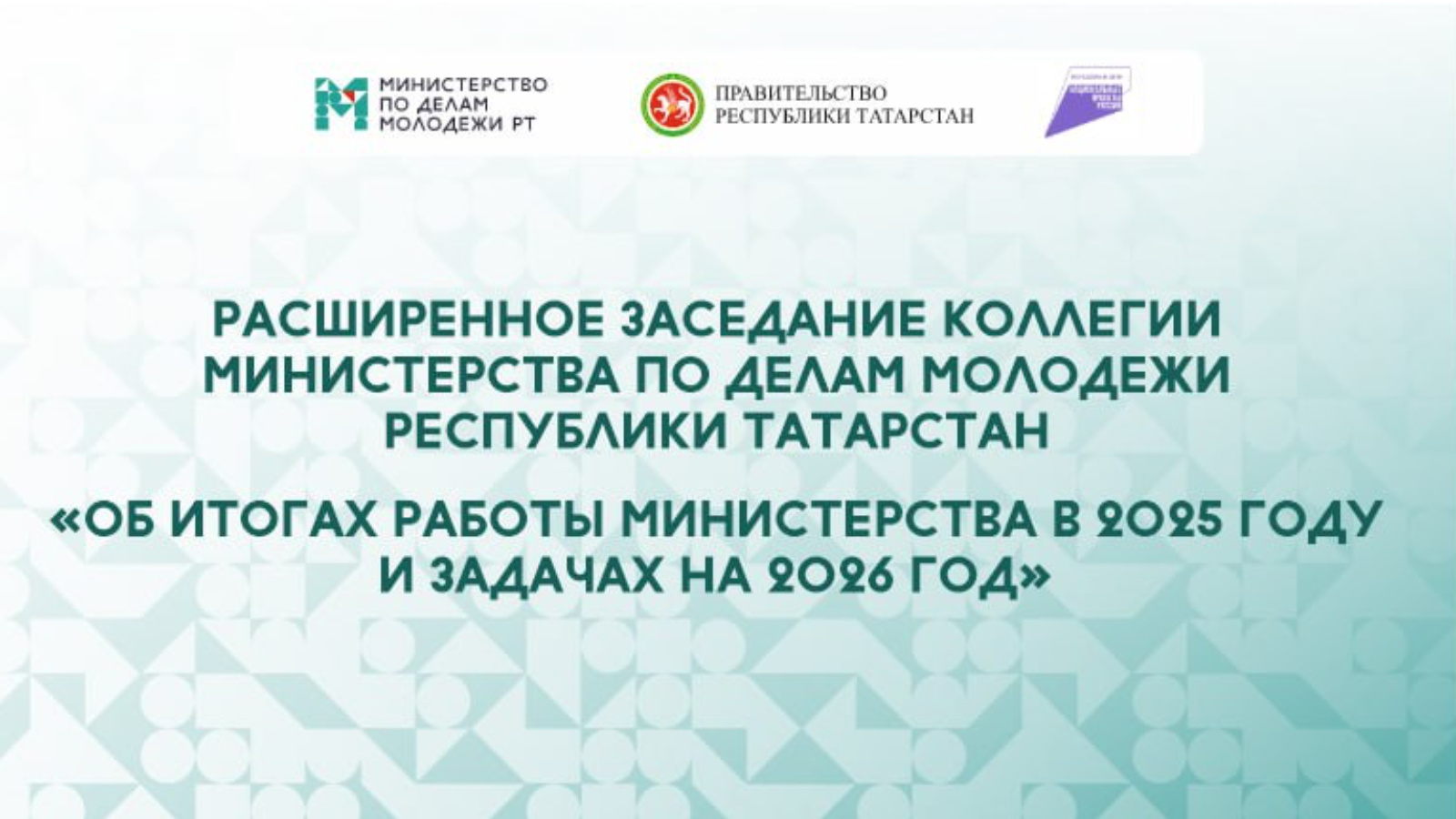 26 января в 10:00 в Поволжском университете физической культуры, спорта и туризма (г. Казань, тер. Деревни Универсиады, 35) состоится коллегия Министерства по делам молодежи Республики Татарстан. Об основных итогах деятельности Ведомства в 2025 году и задачах на 2026 год расскажет Министр по делам молодежи Республики Татарстан Азат Кадыров.