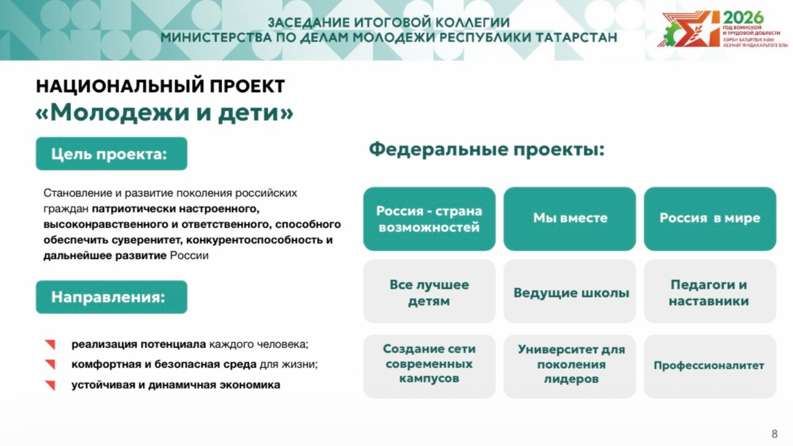 На итоговой коллегии министерства по делам молодежи РТ подвели итоги реализации национального проекта «Молодёжь и дети». Регион участвует в 3 федеральных проектах нацпроекта и демонстрирует устойчивые результаты по всем ключевым направлениям.