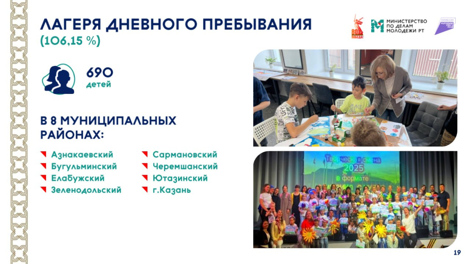 «Узган елдан башлап яшьләр сәясәте, мәдәният һәм спорт учреждениеләре базасында оештырылган көндезге лагерьларны уңышлы уздырып киләбез. Быел да бу уңай практиканы дәвам иттек. 8 муниципаль берәмлектә: Азнакай, Бөгелмә, Алабуга, Яшел Үзән, Сарман, Чирмешән, Ютазы районнарында һәм Казан шәһәрендә 690 кеше катнашында көндезге лагерьлар узды», - дип сөйләде ул.